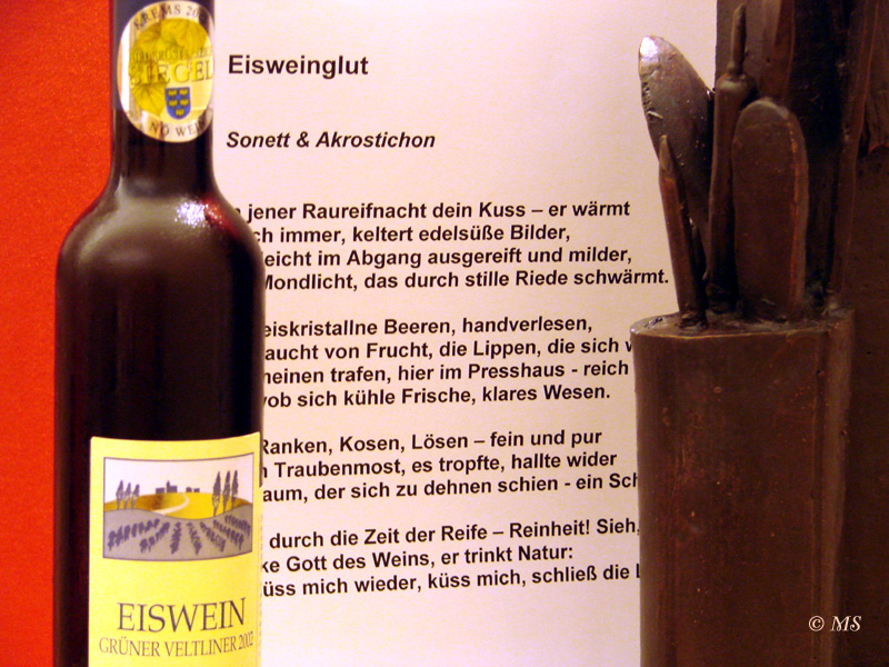 Zur GedichtideeMeine Passsion gilt dem Sonett. Daher war es von vornherein klar, den Wettbewerb mit dieser Gedichtgattung, der Königsdisziplin unter den gebundenen Gedichtformen, zu bestreiten. Weniger klar war mir allerdings zunächst die inhaltliche Komponente. Da die Ausschreibung eindeutig die Richtung vorgab, den Bezug zum Thema „Österreichischer Wein“, stand ich vor den Fragen: Welchen Schwerpunkt setze ich? Und wie setze ich diesen um? Sie werden sich vielleicht schon gefragt haben, welche Bewndtnis es mit der Flasche Wein hatte, die ich bei der Preisverleihung in Händen hielt. Nun, da ich sehr intuitiv an die Dinge heran gehe, ließ ich mir auch die nötige Zeit, um mich von einem geeignetem Anlass inspirieren zu lassen. Geraume Zeit später sprang mir beim Sichten verschiedener Dinge eine Flasche Eiswein vom Weingut Loiskandl aus Grund im Weinviertel ins Auge. „Das ist es!“, dachte ich mir und das war es letztendlich auch... Österreich ist weltweit schließlich eines der führenden Länder in der Eisweinproduktion. Einem Nischenprodukt, das dem Winzer und seinen Helfern sehr viel abverlangt und bei dem er bei der Produktion stets das Risiko eines Totalausfalls trägt. Klappt alles, wird er mit einem Dessertwein der Spitzenklasse belohnt der trotz der geringen Ertragsmenge alle Mühen schnell vergessen lässt. Damit stand mein Schwerpunkt fest und ales weitere entwickelte sich Schlag auf Schlag. Eine Geschichte sollte erzählt werden, eine Geschichte, die die Edelsuße dieses Weines in all ihren Facetten widerspiegelt: „Eisweinglut“ Zum Wohl!